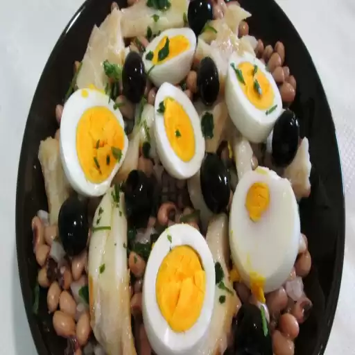 Feijão fradinho , Bacalhau, Tomate, Cebola, Pimentão, azeitona e ovos