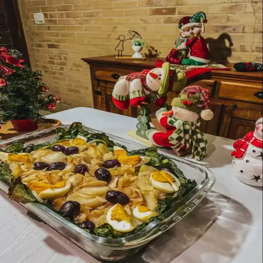 500gr de Bacalhau, couve, ovos, azeitona preta e cebola assados no forno!